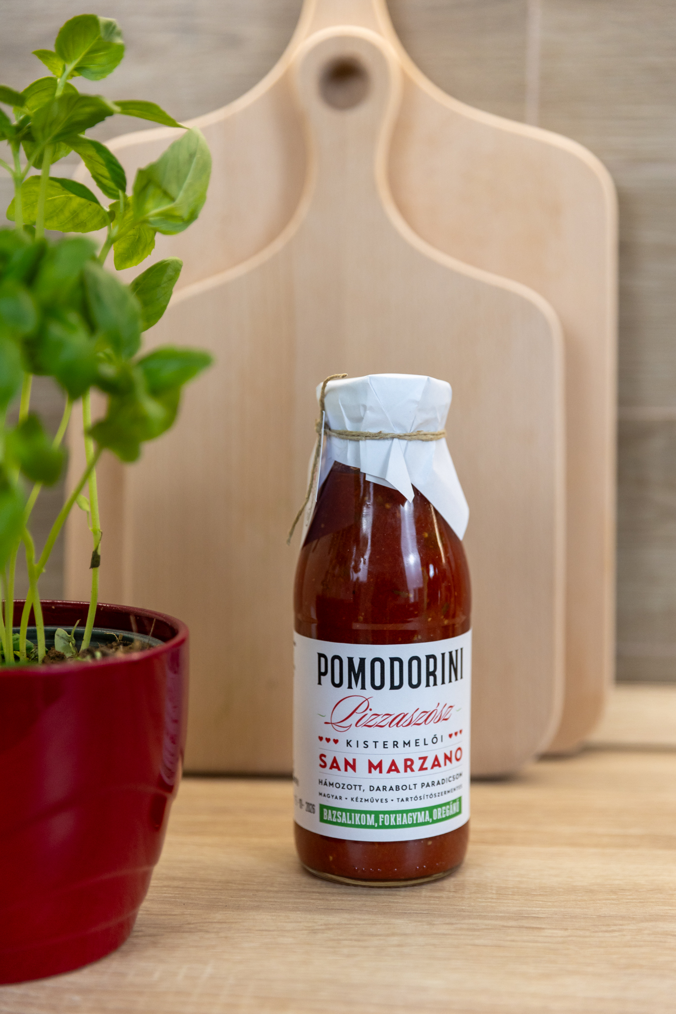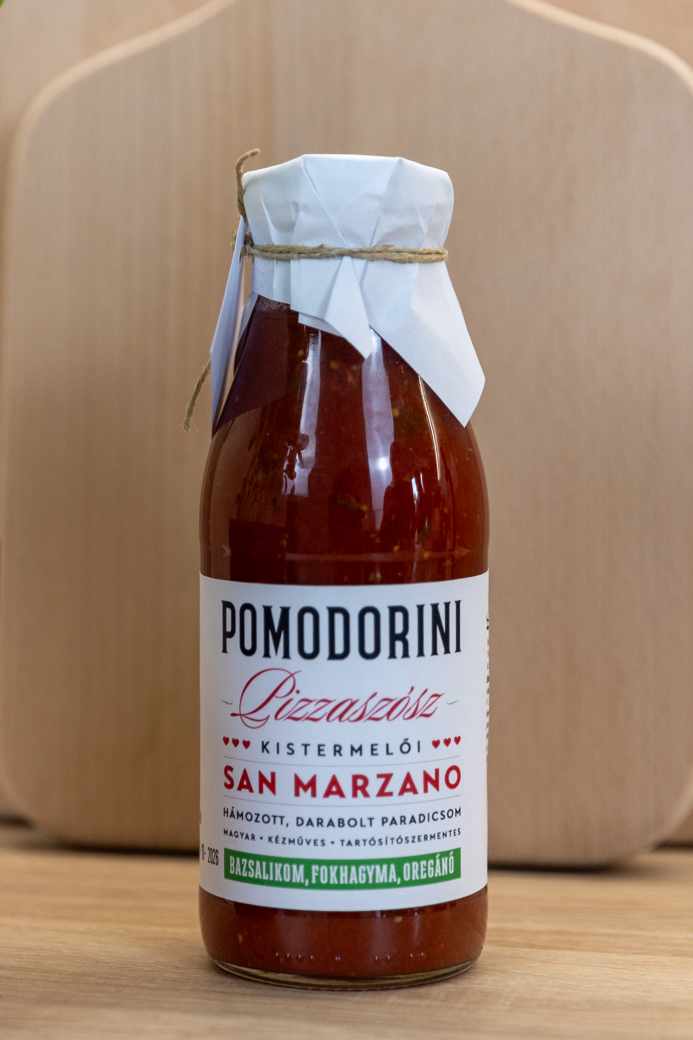 A pomodorini pizzaszósz enyhén fűszerezett: bazsalikom, oregánó,só, fokhagyma,